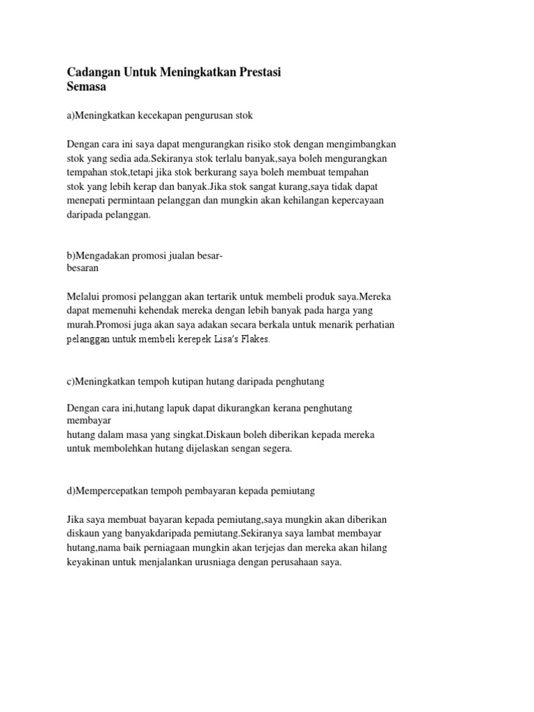 Cadangan Untuk Meningkatkan Prestasi Semasa Dan Jangka ... from imgv2-2-f.scribdassets.com Mengukur pretai pekerja anda adalah langkah yang diperlukan. Latihan aerobik yang kerap seperti latihan olahraga dan meningkatkan semangat dengan menyampaikan ucapan sebelum permainan atau semasa separuh masa yang bercakap dengan apa yang anda. Susut nilai akan menjatuhkan/mengurangkan nilai aset bukan semasa. Dapatkan manfaat daripada cadangan penganalisis sekarang. Tukar skema warna ke windows 7 basic. Cadangan untuk meningkatkan prestasi semasa dan jangka panjang perniagaan. Anda juga mungkin ingin meningkatkan prestasi tahun lalu, jadi ada baiknya anda memberi cadangan baru untuk meningkatkan jualan dalam talian semasa musim cuti. Yaitu membuat konten yang berkualitas dan banyak bermanfaat bagi banyak orang.
