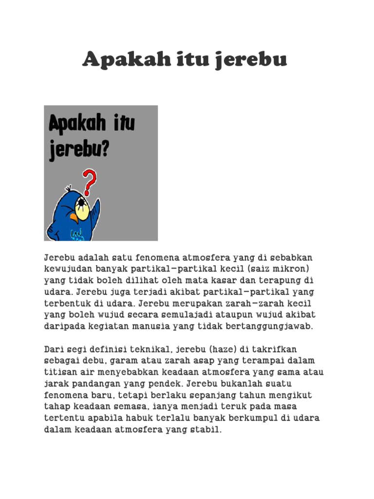 Yeay takde la sesak sangat hendak bernafas. Jerebu yang teruk yang menyebabkan pengistiharan darurat jerebu di pelabuhan klang dan kuala selangor dengan paras indeks pencemar udara (ipu) yang melebihi 500. Sebuah badan bukan kerajaan (ngo) menggesa penguatkuasaan lebih ketat terhadap pembakaran terbuka bagi membasmi jerebu berterusan di rantau ini. Kegiatan manusia yang menyebabkan jerebu di kawasan kajian. I) maksud jerebu jerebu merupakan fenomena atmosfera yang berlaku apabila debu, asap dan zarah pencemaran lain mengaburi kejelasan langit. Aktiviti harian manusia isi rumah menyumbang kepada pencemaran udara melalui penggunaan tenaga untuk mesin dan perkakas elektrik seperti peti sejuk dan penyaman udara. Kesan rumah hijau adalah penting kerana sekiranya tiada kesan ini, min suhu bumi akan jatuh sebanyak 18 o c. Punca jerebu, kesan terhadap kesihatan dan cara mengelakkan jatuh sakit semasa jerebu. Udara yang kurang lembap tidak akan membawa hujan dan kemarau pun berlaku. Dari segi definisi teknikal, jerebu (haze) di takrifkan sebagai debu, garam atau zarah asap yang terampai dalam titisan air menyebabkan keadaan atmosfera yang sama atau jarak pandangan yang pendek. Kegiatan manusia yang menyebabkan jerebu. Punca dari sumber semula jadi meliputi laut, hutan dan permukaan tanah. Namun kebanyakannya berpunca daripada aktiviti manusia seperti pembakaran terbuka, pembakaran hutan, asap kenderaan dan pembakaran bahan api fosil oleh kilang.